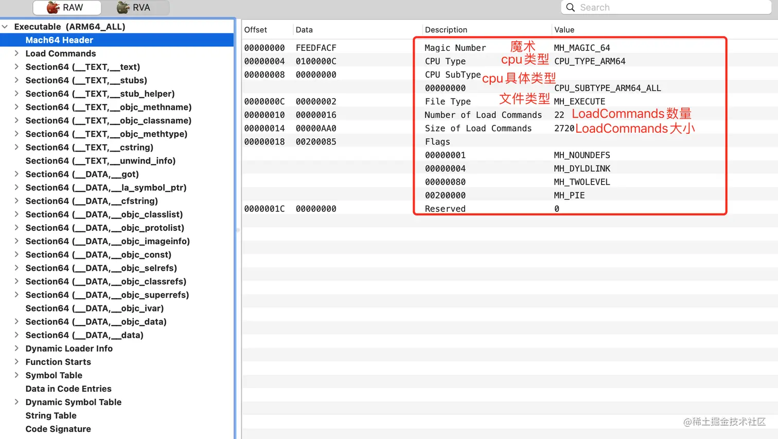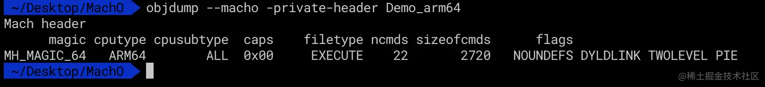使用objdump --macho -private-header命令查看Mach-O文件,输出对应Header数据结构,与上面对应