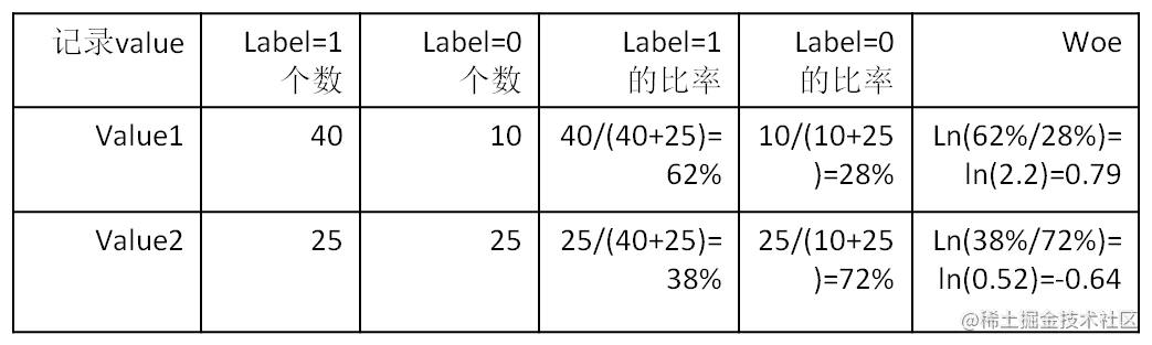 Thinking:对于二分类问题共100条记录,一个自变量只有两个值value1, value2,如何计算value1, value2对应的woe1, woe2?