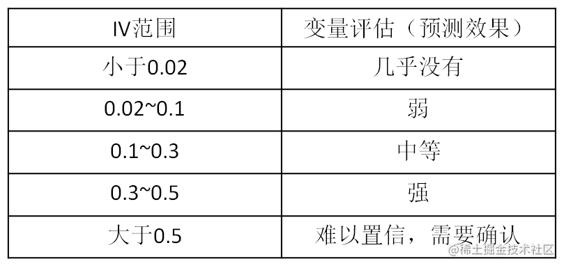 IV是与WOE密切相关的一个指标,在应用实践中,评价标准可参考如下: