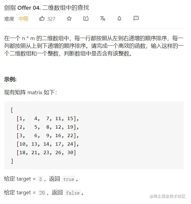 - 本题主要是从二维数组的左下角的元素出发,不断的进行移动比较,因为本题给出的二维数组存在一个特点就是,从左小角的元素出发,一列的元素中,上面的元素总是比下面的元素小,一行的元素中,右边的元素总是比左边的大,这个特点就是我们解题的关键。
