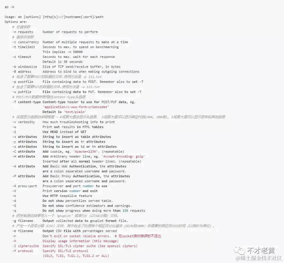 运行一下ab -h就可以看到帮助信息。