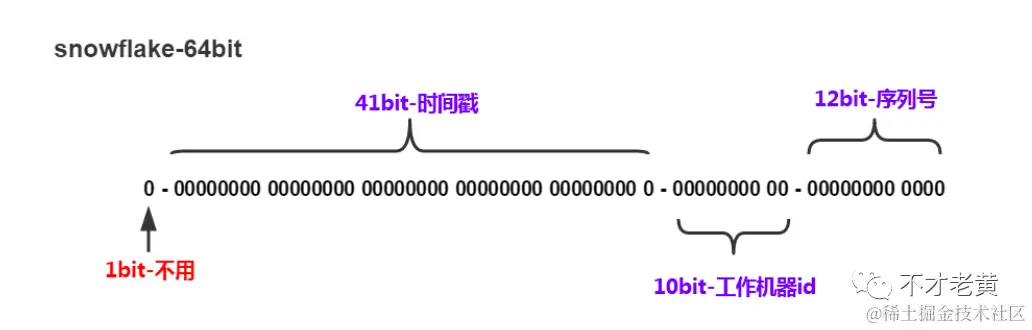 关于雪花算法,大部分文章都可以看到这个图。这个图很好的诠释了雪花算法生成Id的几个重要组成部分,这里也不展开具体介绍了。