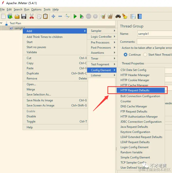 在线程组里面,添加一个 HTTP 请求默认值的配置元件 (HTTP Request Defaults)