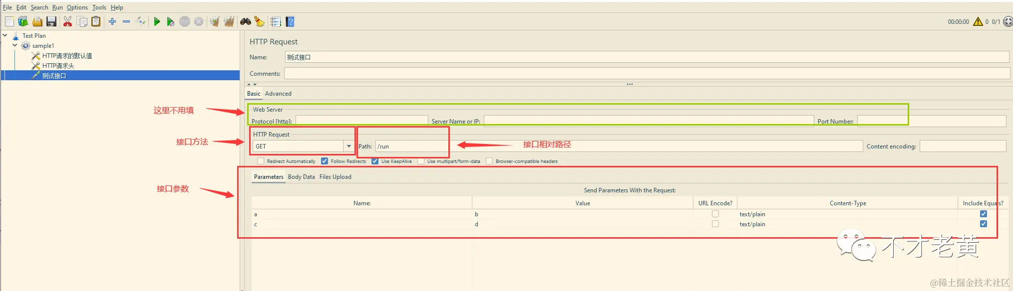- Web Server 这一块内容不用填,我们在 HTTP 请求默认值 里面已经配置了。