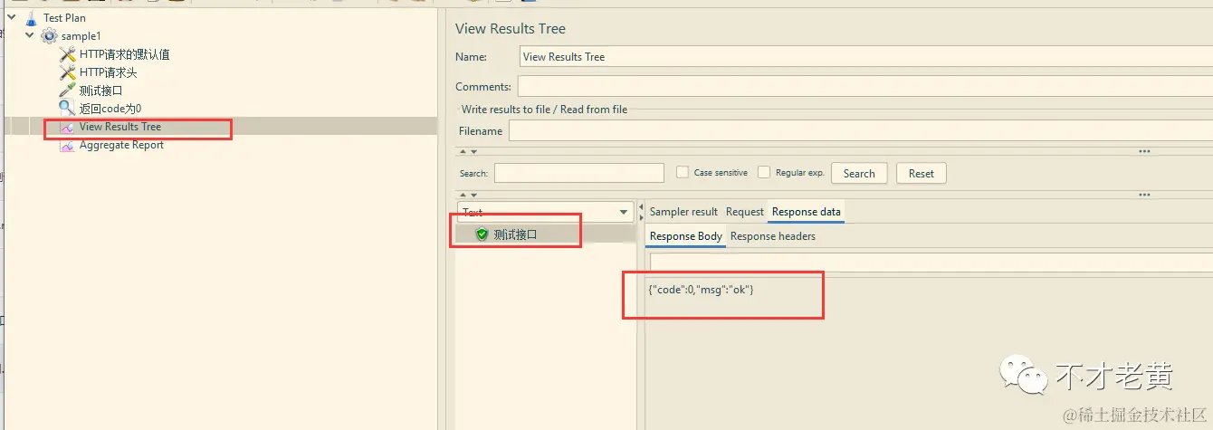 运行一下,打开查看结果树,可以看到测试接口已经跑成功了,返回的 code 确实也是 0。