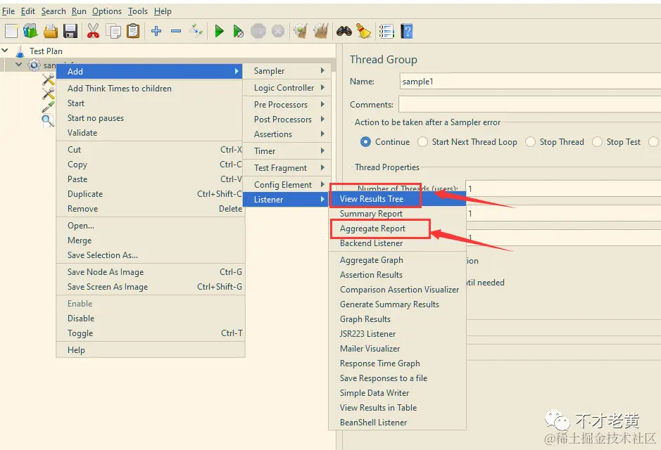 监听器的种类有很多,这里选择查看结果树(View Results Tree)和聚合报告(Aggregate Report)两个。
