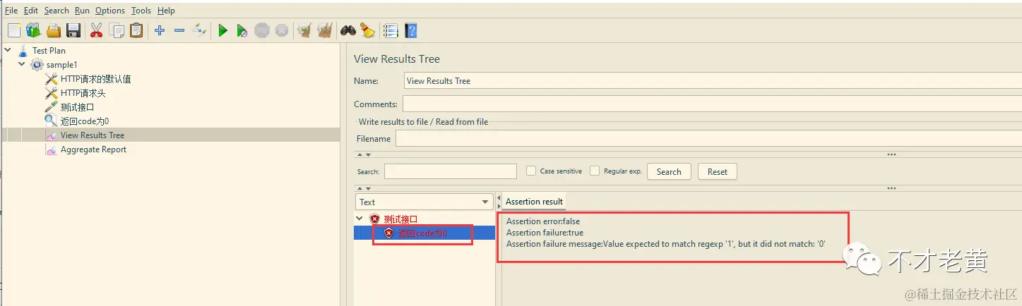 如果把 JSON 断言里面的 code 调整成 1,查看结果树这里就会有错误提示: