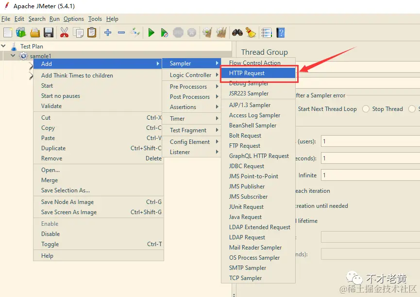在线程组里面添加一个 HTTP Request 类型的 Sampler。