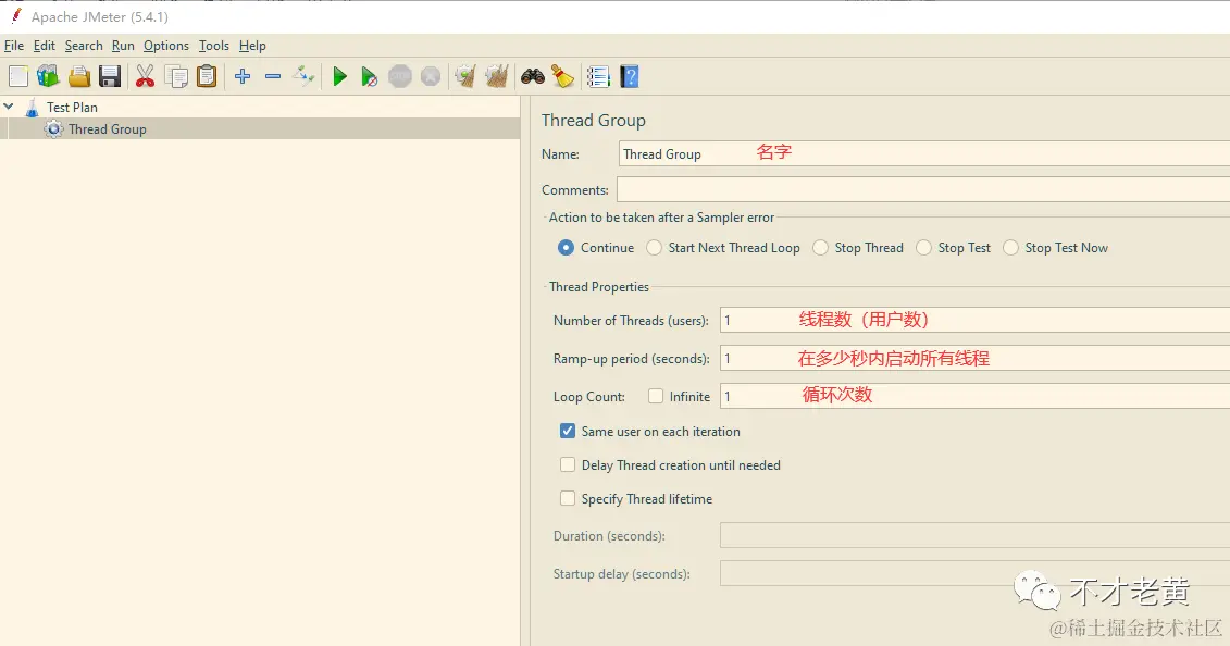 在线程组中,最为主要的就是 Thread Properties 的配置了,不过这里先不对这个进行修改,先保持默认值。