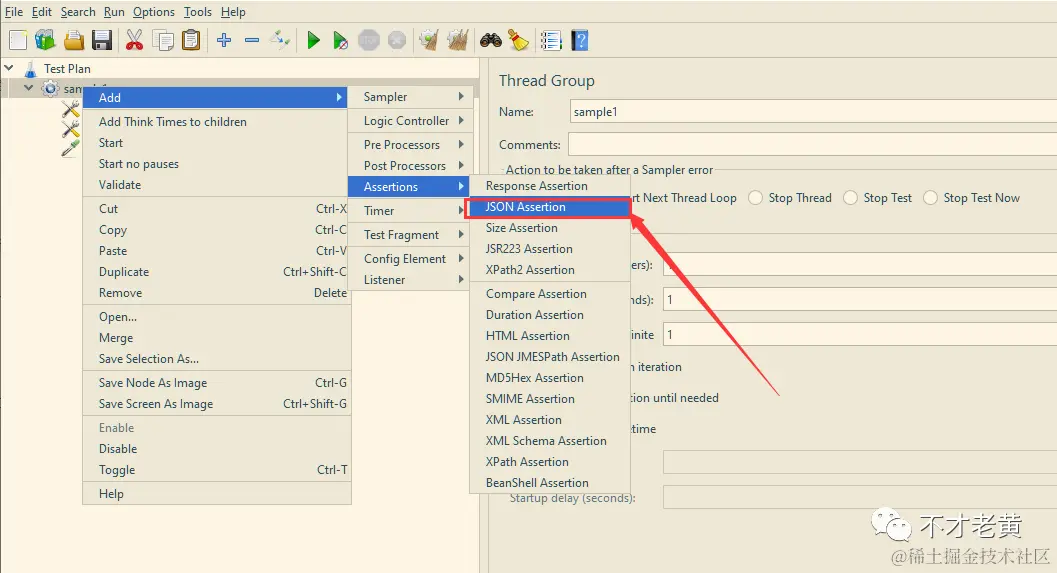 在线程组里面添加一个 JSON 断言(JSON Assertion)