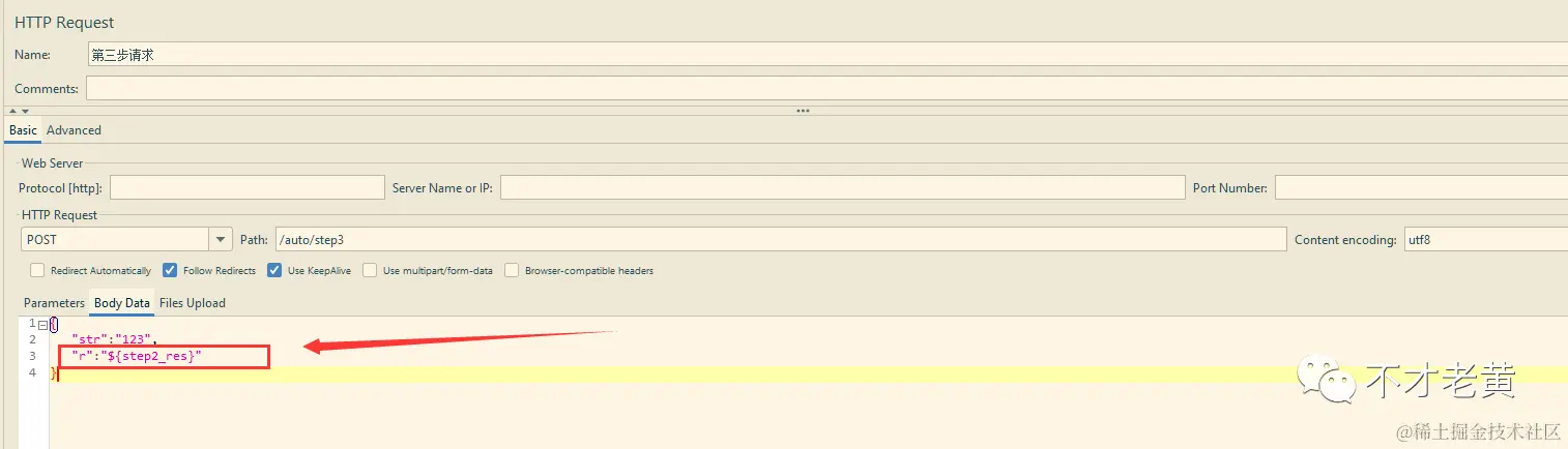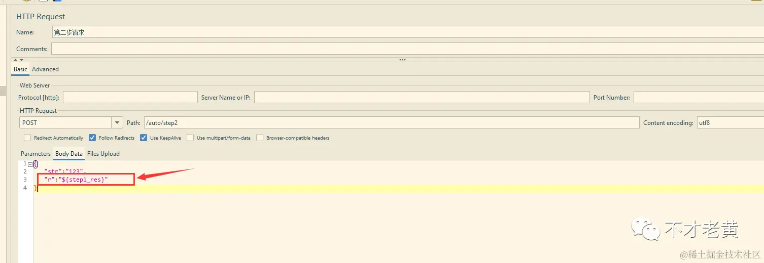 可以看到,这里是直接把步骤一的 JSON Extractor 里面定义的变量名拿过来用了。