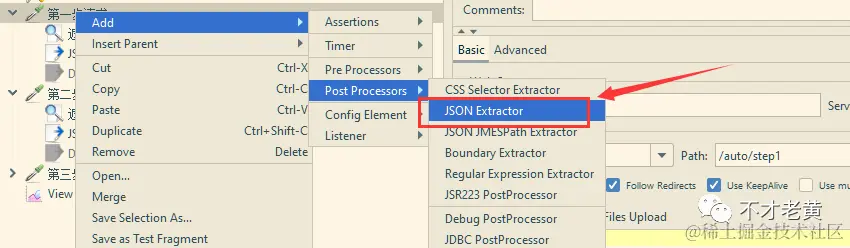用法和参数化的方式差不多。这里继续复刻步骤一的 JSON Extractor,提取步骤三需要的内容。