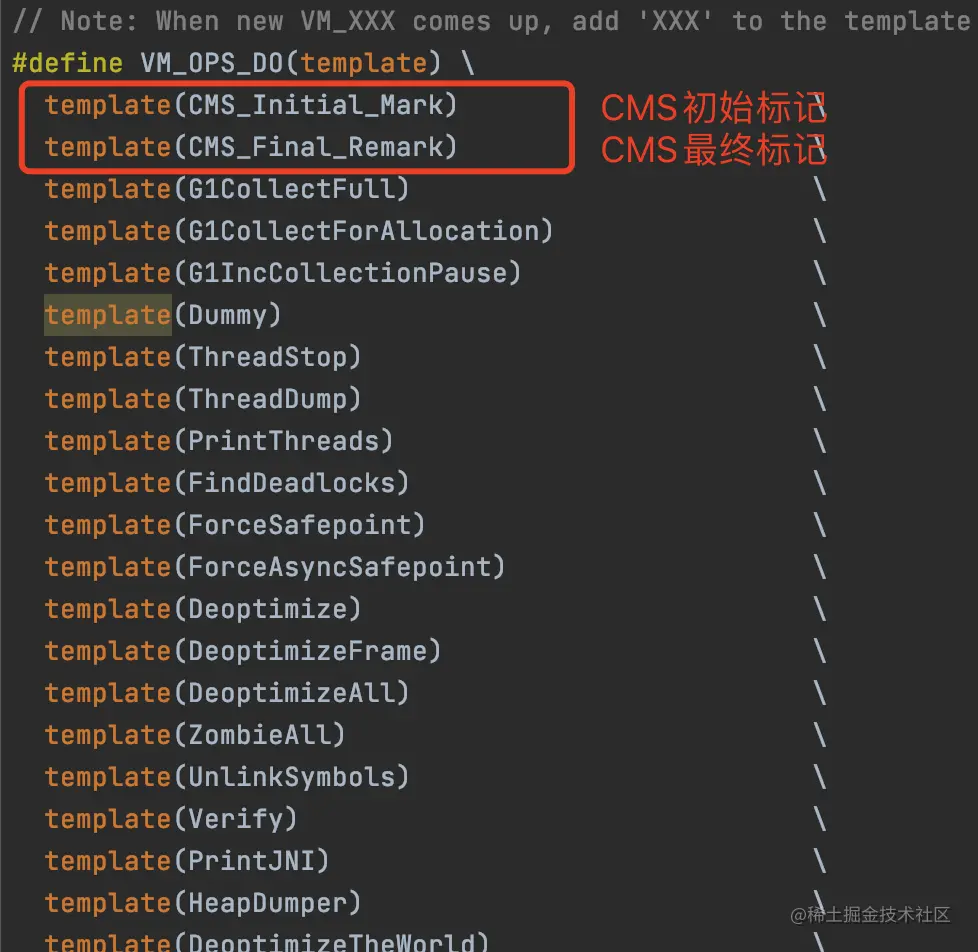 VM 操作类型有很多,JVM 对应的源码在 vm_operations.hpp 定义的宏 VM_OPS_DO 里面。