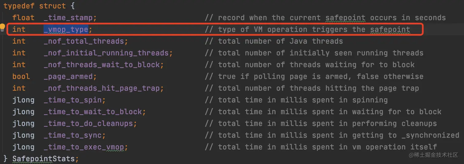而这个 _vmop_typen 呢,是结构体 SafepointStats 中的一个成员,具体的含义是触发安全点的 VM 操作类型。