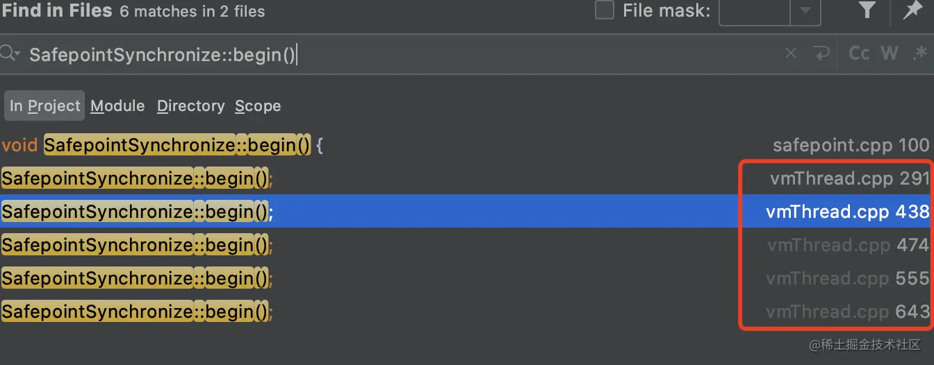我们只需要全局搜一下哪里调用了这个 SafepointSynchronize::begin() 这个方法应该就能找到触发安全点事件对应的代码。