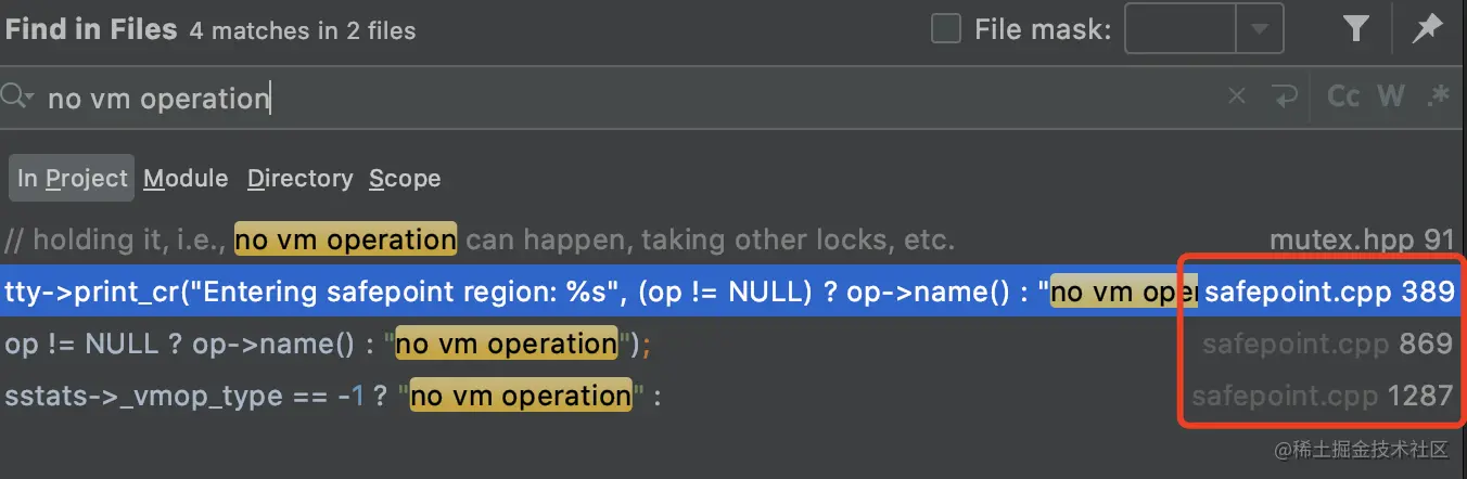 在 JVM 源码里面全局搜索 no vm operation ,发现只有 safepoint.cpp 有这个信息。