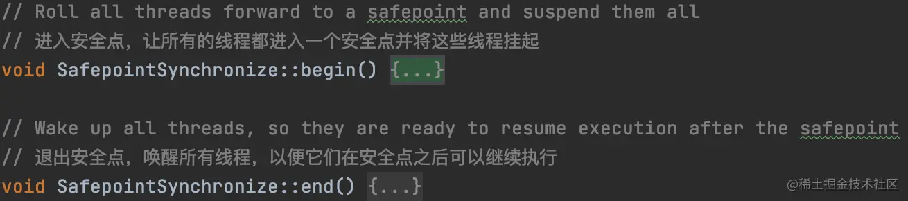 而进入安全点的方法就是 safepoint.cpp 里面的 SafepointSynchronize::begin() 方法。