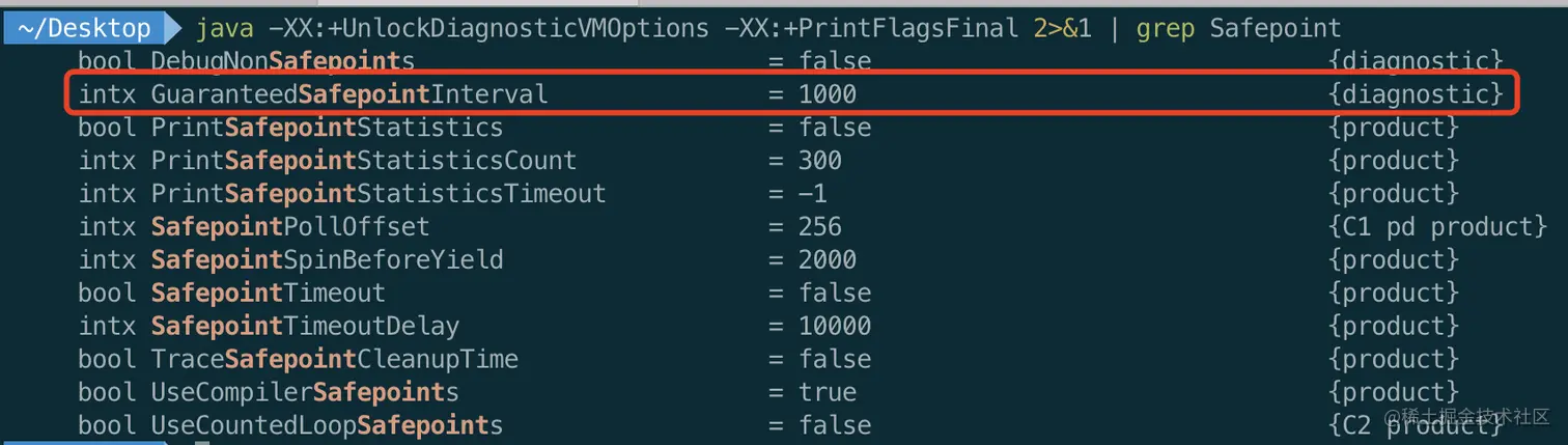 用 java -XX:+UnlockDiagnosticVMOptions -XX:+PrintFlagsFinal 2>&1 | grep Safepoint 命令查看 JVM 关于安全点的默认参数,发现 GuaranteedSafepointInterval 默认设置成了 1 秒,所以条件 2 也能满足。