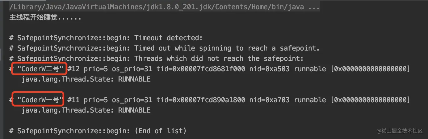 要找出这两个线程也很简单,它不是需要 5000 多毫秒才进入安全点吗,我就加上参数让进入安全点时间超过 5000 毫秒的线程超时就行了。