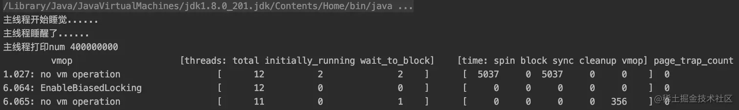 回过头来再看文章开头的代码,通过加上 -XX:GuaranteedSafepointInterval = 0 将进入安全点间隔时间设置成 0,也就是关闭定时进入安全点,看看代码运行结果是怎么样的。