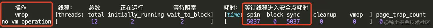JVM 想执行 no vm operation ,这个操作需要线程都进入安全点,整个期间一共有 12 个线程,正在运行的线程有 2 个,需要等待这两个线程进入安全点,等待这 2 个线程进入安全点并阻塞耗费了 5037 毫秒。