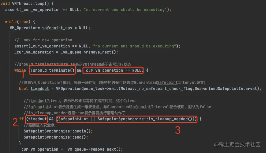 而我们上面苦苦寻找的 no vm operation 原因,就在 VMThread 的 loop() 方法里面。