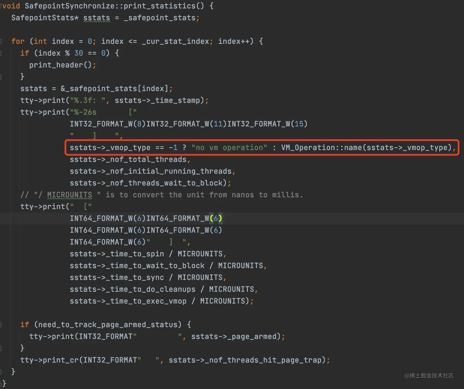 点击去一看,果然,一下子定位到打印日志的地方,就是这个 SafepointSynchronize::print_statistics() 方法。