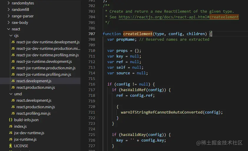 我们可以看到 createElement 这个方法的入参只有三个,也就是刚才看到的编译出来的三个入参。最终会返回一个叫 ReactElement 的对象。