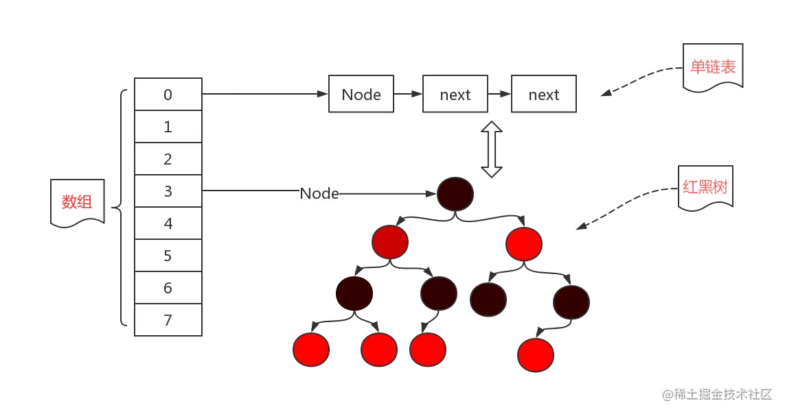 我们的数据一开始是保存在数组里面的,当发生了Hash碰撞的时候,就是在这个数据节点上,生出一个链表,当链表长度达到一定长度的时候,就会把链表转化为红黑树。