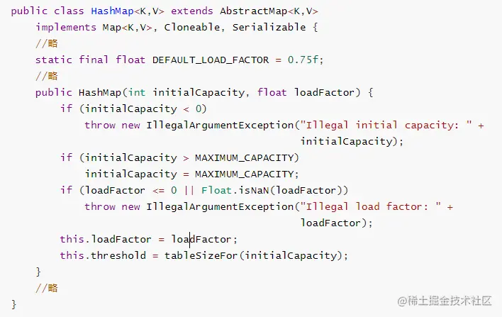 我截取了部分源码,从这里可以看出,系统默认的负载因子值就是0.75,而且我们还可以在构造方法中去指定。下面我们就正式来分析一下为什么是默认的0.75。
