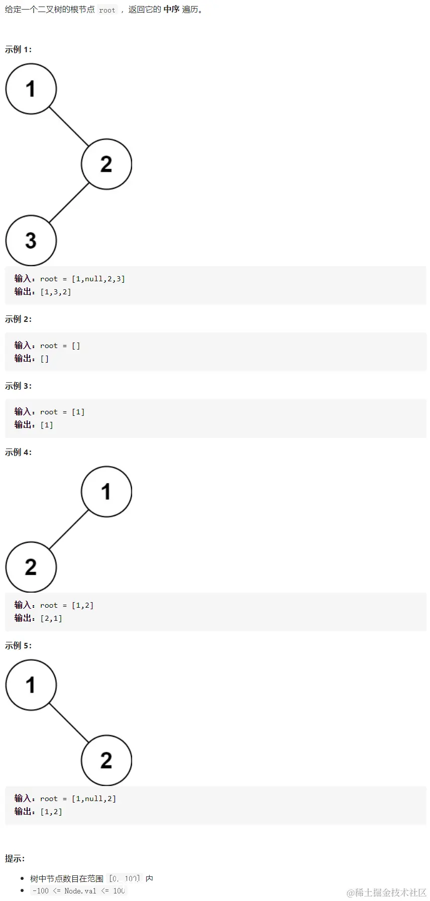 二叉树的中序遍历:按照访问左子树——根节点——右子树的方式遍历这棵树,而在访问左子树或者右子树的时候我们按照同样的方式遍历,直到遍历完整棵树。因此整个遍历过程天然具有递归的性质,我们可以直接用递归函数来模拟这一过程。