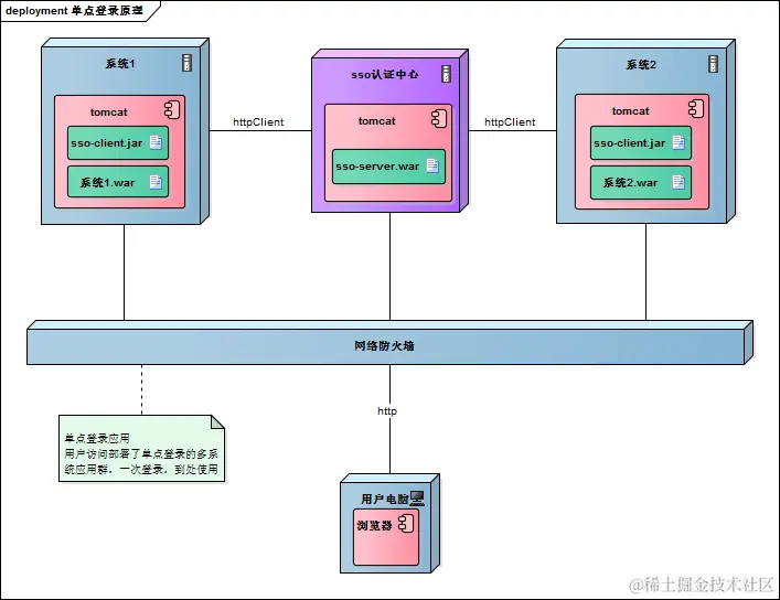 单点登录涉及 sso 认证中心与众子系统,子系统与 sso 认证中心需要通信以交换令牌、校验令牌及发起注销请求,因而子系统必须集成 sso 的客户端,sso 认证中心则是 sso 服务端,整个单点登录过程实质是 sso 客户端与服务端通信的过程,用下图描述