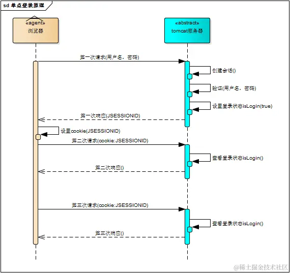 浏览器第一次请求服务器,服务器创建一个会话,并将会话的 id 作为响应的一部分发送给浏览器,浏览器存储会话 id,并在后续第二次和第三次请求中带上会话 id,服务器取得请求中的会话 id 就知道是不是同一个用户了,这个过程用下图说明,后续请求与第一次请求产生了关联