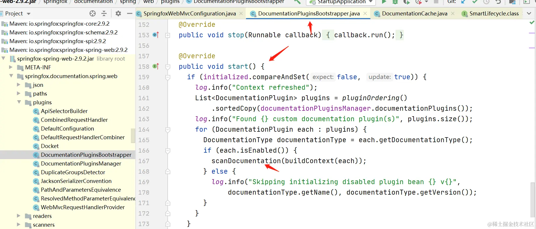 通过调试可以找到swagger2就是通过实现了SmartLifecycle接口的DocumentationPluginsBootstrapper类,当spring容器加载所有bean并完成初始化之后,会回调实现该接口的类(DocumentationPluginsBootstrapper)中对应的方法start()方法,下面会介绍怎么找到这里的。