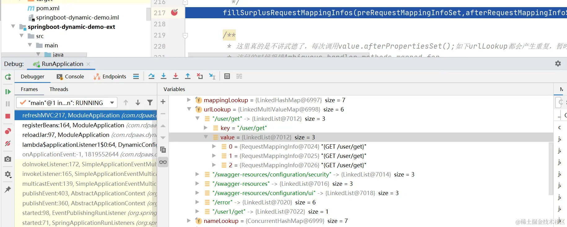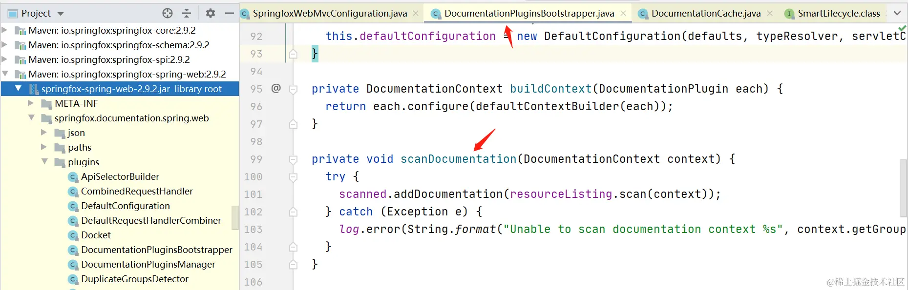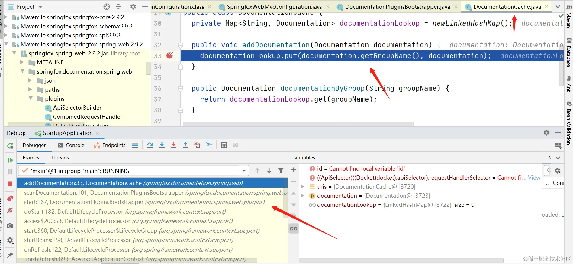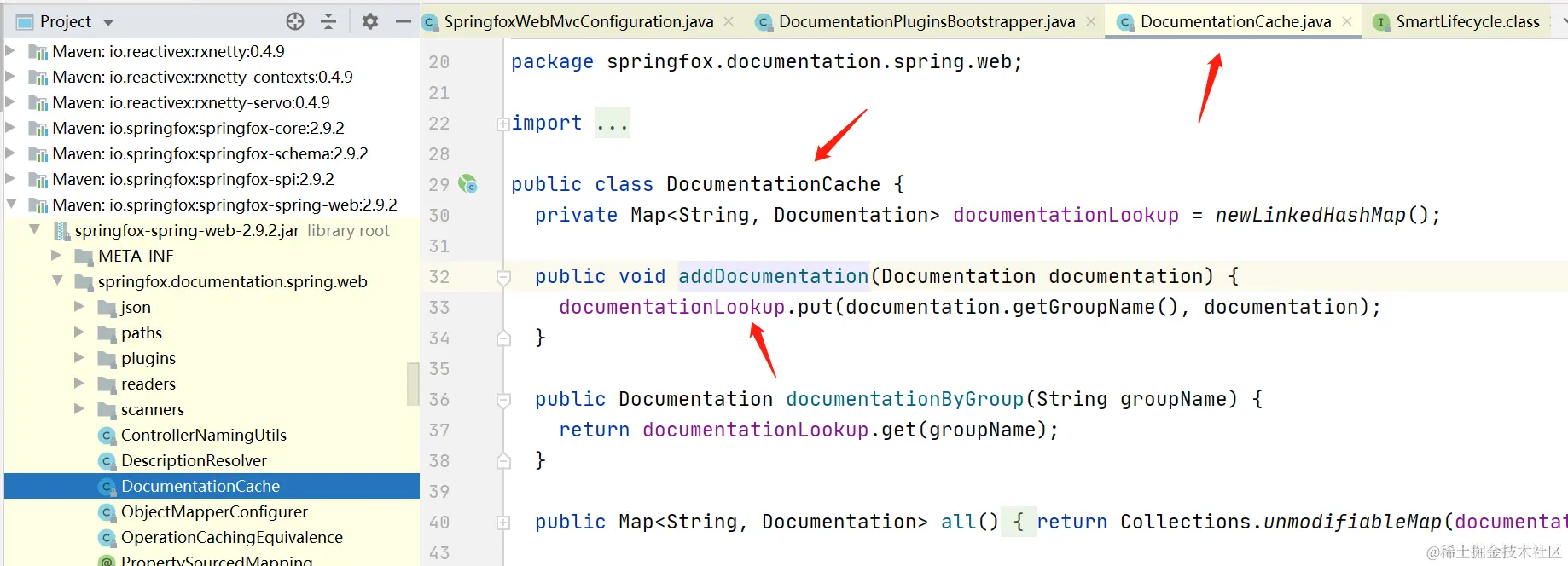 ‘如果找不到解决问题的入口,我们至少可以找到访问文档的上面这个接口地址(出口),发现接口返回的文档json内容是从DocumentationCache里获取,那么我们很明显可以想到肯定有地方存放数据到这个DocumentationCache里,然后其实我们可以直接在addDocumentation方法里打个断点,然后看调试左侧的运行方法栈信息,就可以很明确的看到调用链路了