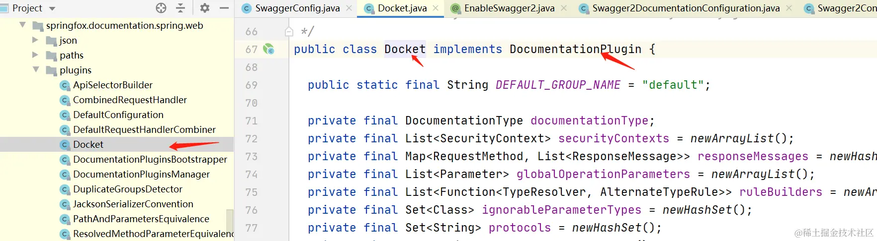 然后再看看下图,应该终于知道咋回事了吧,其实Docket对象我们仅仅需要关心的是basePackage,我们扩展jar包大概率接口所在的包和现有包不一样,所以我们需要新增一个Docket插件,并加入DocumentationPlugin集合,然后调用DocumentationPluginsBootstrapper的stop()方法清掉缓存,再调用start()再次开始解析