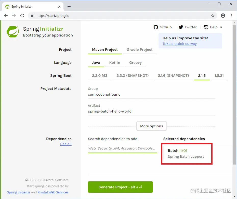 让我们使用Spring Initializr来生成Maven项目。确保选择Batch作为依赖项。
