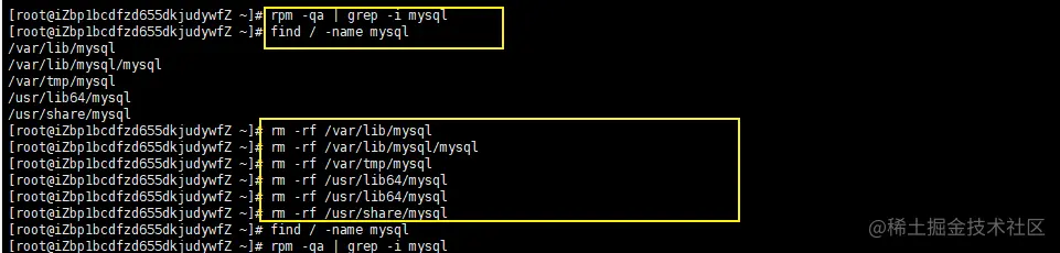 删除完后再次用rpm -qa | grep -i mysql和find / -name mysql检查一下,如果空,就表示卸载成功。
