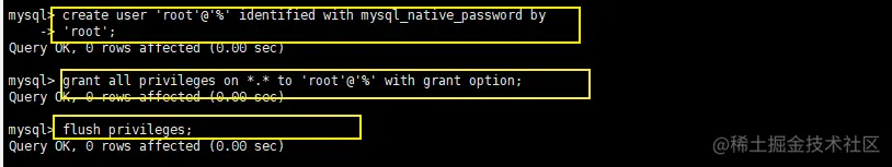create user 'root'@'%' identified with mysql_native_password by 'root';