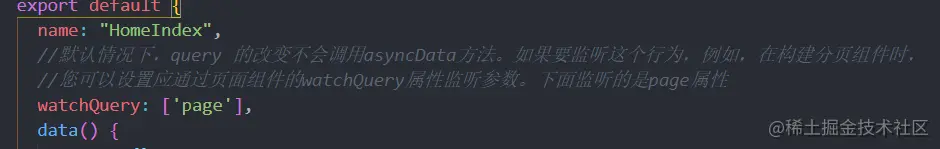 使用watchQuery属性可以监听参数字符串的更改。 如果定义的字符串发生变化,将调用所有组件方法(asyncData, fetch, validate, layout, ...)。 为了提高性能,默认情况下禁用。