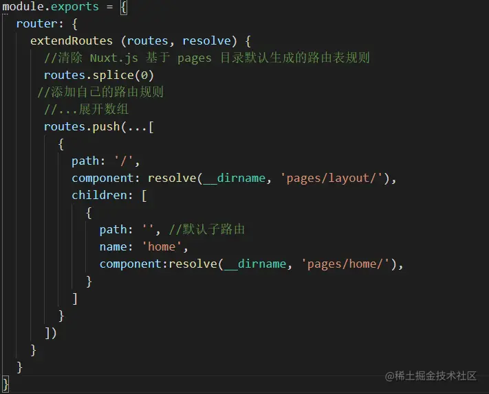 - extendRoutes:你可能希望扩展Nuxt.js创建的路由。你可以通过extendRoutes选项执行此操作。例如自定义路由