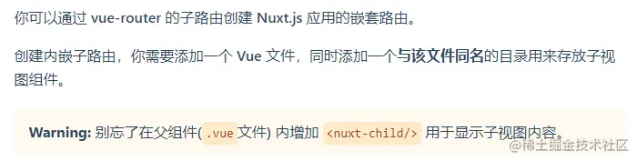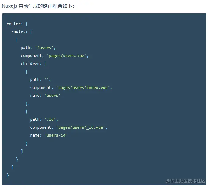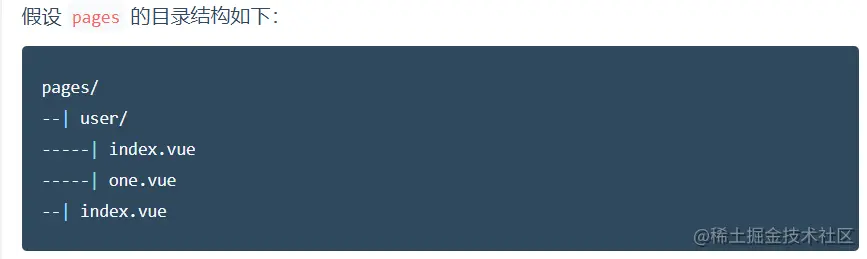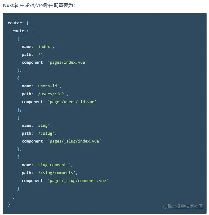 - routeNameSplitter:你可能希望更改 Nuxt.js 使用的路由名称之间的分隔符。你可以通过配置文件中的routeNameSplitter选项执行此操作