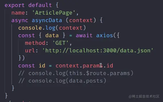 - 可以使用注入asyncData 属性的 context对象来访问动态路由数据