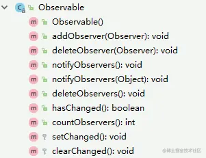 包含:注册观察者(addObserver)、移除观察者(deleteObserver)、通知观察者(notifyObserver)等方法。
