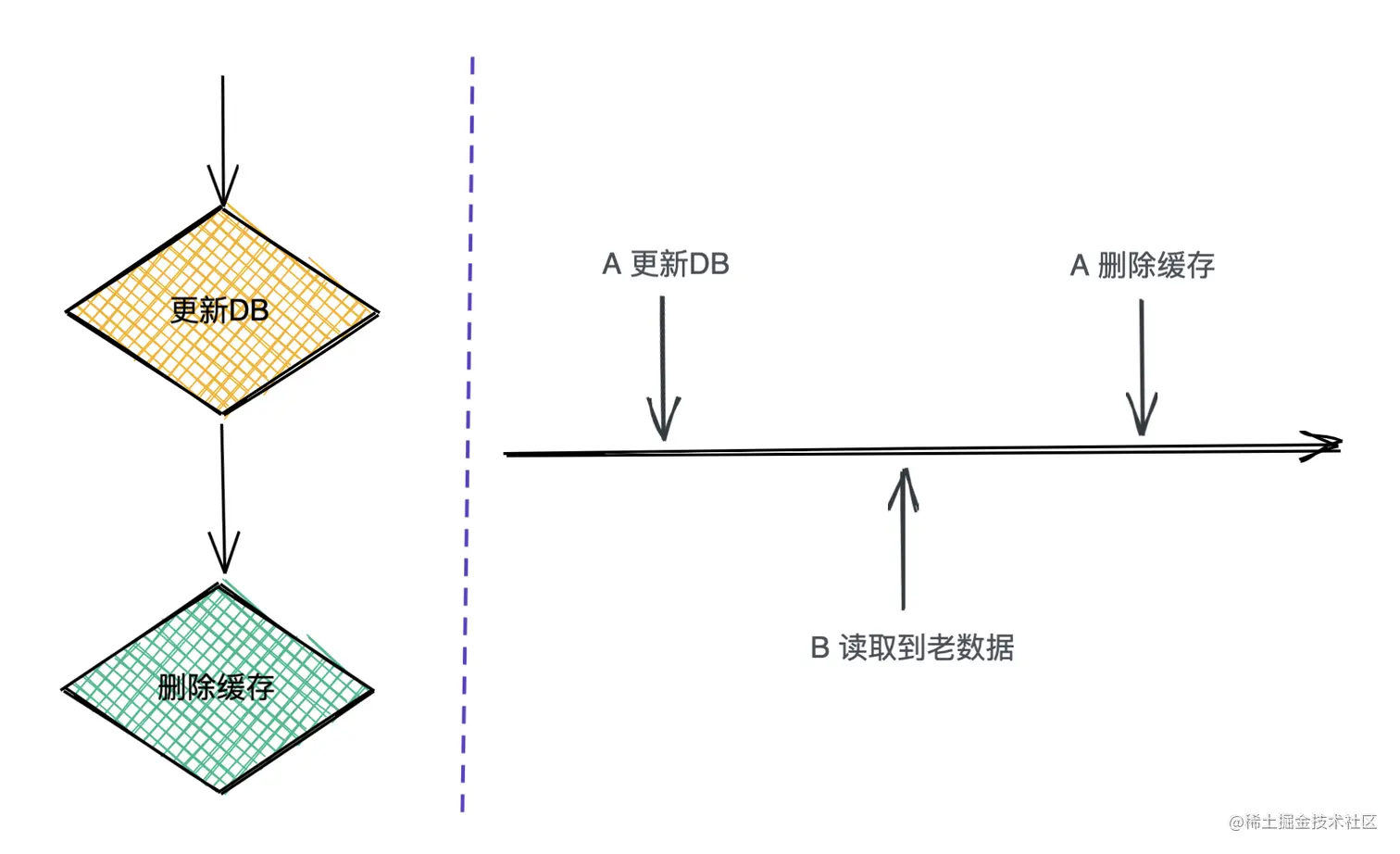 这种做法是遇到数据更新,我们先去删除缓存,然后再去更新DB,如左图。让我们来看一下整个操作的流程: