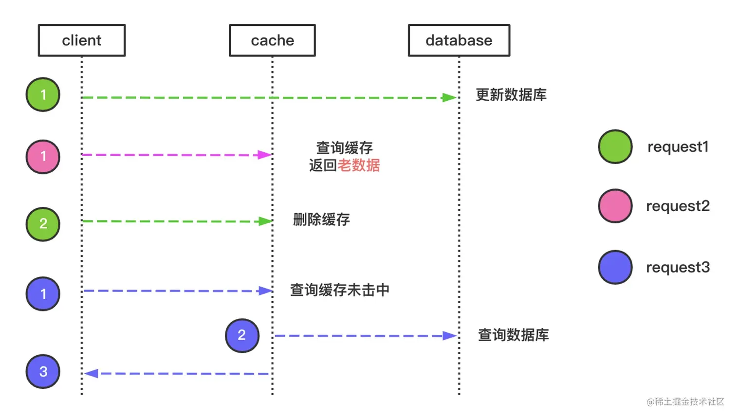 - 请求3再来请求时缓存里没有,就会查询数据库,并回写缓存再返回结果