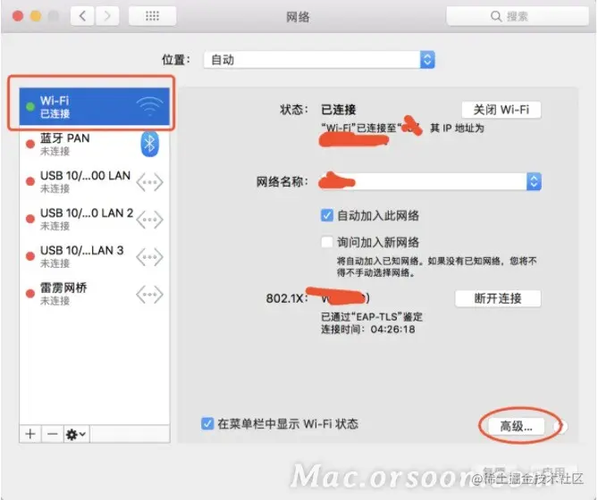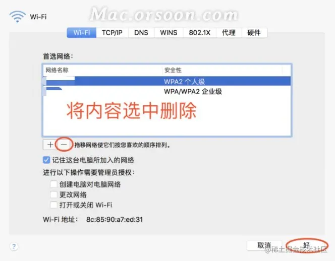 1、打开系统偏好设置—>网络—>WiFi—>高级—>WiFi—>删除首选网络框内的所有网络—>点击好—>点击应用; 截图如下: