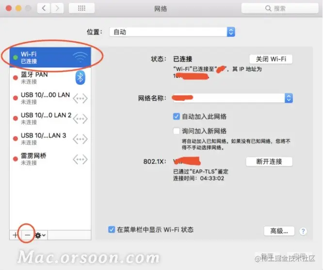 2、在网络页面,在边框有WiFi、蓝牙PAN、网桥等,选中WiFi,点击下面的减号删除WiFi,点击应用;