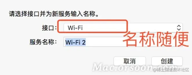 3、在网络页面,在左边框的下方点击加号(+),接口选择WiFi,服务名称随便写,点击创建,然后点击打开WiFi,链接你的WiFi。