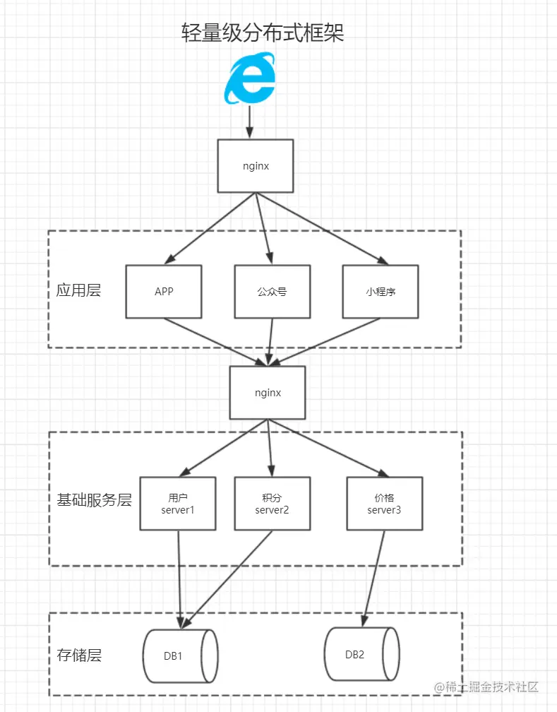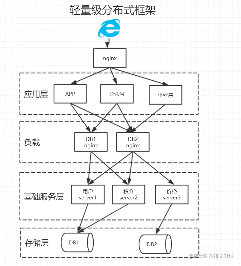 完成nginx内部的负载,Nginx本身还可以根据业务进行垂直拆分。如果用户server1,直接到serverN了怎么办,其实这个架构本身就是轻量级的,本身就支持不了了。